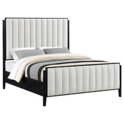 You're going to love the understated character and plush comfort of a modern wooden bed. Designed for refined flair in your bedroom, it boasts a tall headboard and low footboard. Each is accentuated with ivory upholstery over foam cushioning, with vertical channel tufting that creates texture and dimension. A black wood grain finish adds organic flair and beautiful contrast. Tapered legs complete the look of this chic bed.