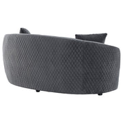 Bold contrast is achieved with the sophisticated gold trim featured on a modern loveseat. Designed to make a statement, the loveseat is a chic curved kidney silhouette with tight upholstery over its seat and a channel tufted back. The outer back and arm surface adds diamond quilting to create inviting texture, while a pair of accent pillows provide custom comfort. The loveseat shows off sloping arms for a streamlined profile that's smooth and sleek in your space. Choose this loveseat for a bit of fresh perspective in your living room or den.