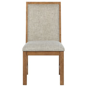 Soothing natural, neutral hues introduce refined style to a modern room set. Offering a soft natural brown wood grain finish over ash veneer and Asian hardwood, the set delivers an inviting, approachable ambiance to your kitchen or dining room. The table features a spacious rectangular tabletop with angled legs and an angular apron, creating eye-catching flair. Chairs offer soft oatmeal fabric upholstery over plush foam padding, and feature wooden ladder details on chair backs, adding a sense of character and structure. This charming set is a perfect choice for a family dining room.