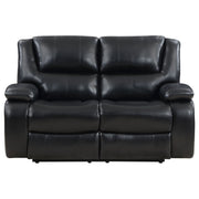 Bold black leatherette upholstery offers the look of luxurious leather with easy-care maintenance as the two-piece motion sofa set is versatile and beautiful. Living rooms, family rooms, and media venues become comfort zones with the plump feel and clean design of a classic sofa and loveseat set built for hours of seating comfort as well as entertaining. Manual reclining is easy and pleasant, allowing a variety of positions for sitting and lounging. Choose this elegant sofa set with pillowy support, as attached seat and back cushions feature plump foam filling with channeling to target body comfort and padded armrests over rounded sides. Entertain in style and sheer comfort with a motion sofa set that’s ideal for lounging and napping.