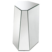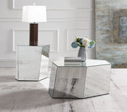 This mirrored end table features a hexagonal silhouette and geometric design for a glamorous contemporary look. Irregular sides add visual interest, while sleek mirrored surfaces reflect light and sophistication. Fully set up and ready to use, this refined piece is perfect for enhancing the style of modern interiors with elegance and functionality.