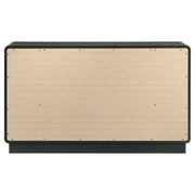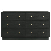 Complement a stylish bedroom with the abundant storage featured in a modern six-drawer dresser. Delivering a sophisticated presentation, it boasts a black finish over melamine surfaces that resist damage to remain looking their best. Ball knobs complement each drawer front, standing out with a rich, warm brass finish. The case of the dresser features rounded corners, softening the overall presentation of the dresser. A wide top is ideal for jewelry boxes and decor that lends a personalized touch.