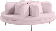 Bring untold elegance to your room with this Circlet velvet roundabout sofa. This exceptionally crafted piece of furniture is upholstered with soft pink velvet material that���s sumptuous to the touch. The four back cushions and matching pillows are comforting to the back as you and guests sit, and the gold iron legs make the sofa a sturdy addition to your room.