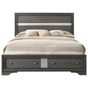 Crown Mark Regata King Storage Bed in Grey. Create your own contemporary sanctuary with this collection of bedroom furniture. Each piece pairs shimmering silver accents with elegant case designs to produce a look that is both modern and glamorous, but not over the top. Furthermore, each bed features footboard storage to make your bedroom just that more functional. Finally, every piece in this collection is available in either a grey or black finish.