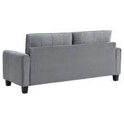 Create a welcoming, refined living space with a modern two-piece sofa set. Each is upholstered in velvety soft gray fabric, with stitching accents that add depth and detail. Plush cushions include reversible back pillows, with sinuous spring decking under seats to ensure support and comfort. Rounded arms define its structured silhouette, complete with piping trim and subtle pleating that adds dimension. Add colorful accent pillows to bring a personalized touch.