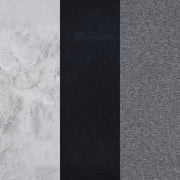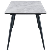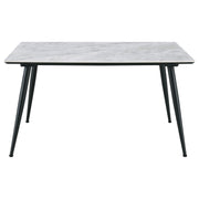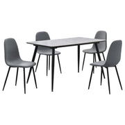 Bring approachable contemporary style to your kitchen or dining room with this five-piece dining set. It centers on a rectangular table that pairs tapering, splayed metal tube legs with a marbled look to its table top. The grey and sandy black combination is enhanced with matching side chairs. Each boasts a grey bucket-style seat for comfortable seating. This modern set offers a light, airy ambiance, perfect for an eat-in kitchen or breakfast nook.