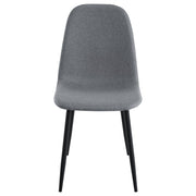 Create an inviting ambiance with a set of four contemporary side chairs. Perfect for a kitchen or dining room table, the chairs boast a light, airy silhouette with stylish, updated appeal. Each includes neutral gray upholstery and a bucket seat that delivers inviting comfort and support. Chairs stand on splayed legs crafted from metal tube with a black finish that blends into surrounding decor. Legs are complete with plastic glides that add protection for delicate flooring.