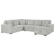 This versatile corduroy sleeper sectional effortlessly converts from cozy seating to a comfortable guest bed with its pop-up sleep surface. A spacious storage chaise keeps essentials at hand, while plush upholstery and three matching pillows provide lasting comfort and style. Its neutral tone complements any décor, making this piece an ideal centerpiece for relaxation, entertainment, and accommodating overnight guests. Built for durability, it seamlessly blends form, function, and modern appeal.