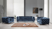 A display of irresistible warmth and pleasure, the Divani Casa Delilah Modern Blue Fabric Loveseat features tufted buttons on the diamond stitching that covers its whole surface. Upholstered in soothing blue Velour fabric, this loveseat comes with soft thick cushioned seats. Standing on ritzy black stainless steel legs, this modern loveseat is a consoling piece of creation.