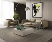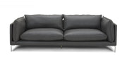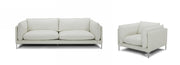 This fully upholstered modern sofa, which is available in either white L-grade leather, features two oversized cushions. In total, there are six cushions on this couch, two seat cushions, two back cushions and two arm cushions. All six cushions feature a self-welt detail. All of these fluffy cushions sit atop a tight, upholstered frame, chrome bracket style legs and tuxedo arm. This Stylish Piece is perfect for your contemporary living space.
