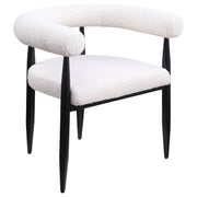 Create a fresh, modern accent in your living room or foyer with a modern armchair that blends Mid-century modern elements with a touch of contemporary flair. Its metal frame is solid and durable, with a light airy look and feel. The chair pairs a black finish with tapering legs, accentuating a contemporary look. The upholstery is a plush 100% polyester teddy fabric in a soft, warm cream color that complements any setting. The chair features an open C-shaped backrest, a unique twist on the original U-shaped back and armrests, that highlights its impressive silhouette to bring distinctive flair to your space. This blend of styles and textures creates a chair that is both comfortable and stylish, perfect for any modern home.