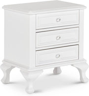 Elements Jesse 3 Drawers Nightstand in White JS700NS. The charming Jesse bed guarantees your little one sweet dreams. Its beautifully crafted bed features a faux leather headboard adorned with chic white buttons. Beautifully arched cabriole feet and crystal-like knobs accent its lovely case pieces while a roll-out bed trundle allows easy access to storage. Dustproof case pieces, dovetail drawers, and solid wood frames ensure the sturdiness of this adorable set.