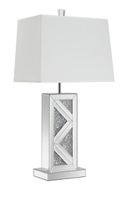 This statement-making table lamp features a rectangular base adorned with mirrored paneling and a bold chevron design inlaid with crushed crystal acrylic. A crisp white shade balances the shimmering base with a clean, structured silhouette. The geometric accents and reflective surfaces create a dramatic focal point for living rooms, bedrooms, or entryways. Designed to dazzle, this lamp adds ambient lighting with a touch of glam-inspired sophistication.