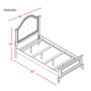 The Jesse Twin Panel Bed w/ Trundle guarantees sweet dreams for your little one. This delicate design features a faux leather headboard adorned with chic white buttons. Beautifully arched cabriole feet and intricate moldings accent this lovely bed while crystal like knobs give easy access to its rolling trundle. - Faux leather headboard - White button accents - Arched Cabriole feet - Delicate moldings - Rolling trundle holds a low profile twin mattress or can be used as extra storage Solid wood; plywood; particle board with Gumtree veneer; engineered wood; pine wood; PU; acrylic and metal knobs with screw 86 D x 46 W x 55 H, 95lbs. 1 Year Limited Manufacturer Warranty