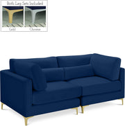 Ready to get cozy? Curl up from the welcoming confines of this Julia velvet modular sofa and you can do just that! Its soft navy velvet upholstery is soft and supple to the skin, coaxing you to relax, unwind, and sit for a spell. It comes with both gold and chrome legs for a customizable and contemporary finish. Pair this Julia piece with others to form an infinite number of seating configurations to meet your particular decorative desires and space requirements.