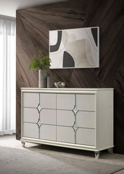 Enhance your bedroom’s allure with this exquisite 6-drawer dresser, a masterpiece of modern design and practical elegance. The pearl white finish, complemented by mirror framing and unique diamond star drawer fronts, exudes sophistication. Special features like the removable jewelry tray in a secret drawer and polished chrome accents elevate this dresser to a class of its own. With ample storage and finger tab chrome metal pulls, this piece combines functionality with style. Make a statement in your bedroom with this captivating dresser.