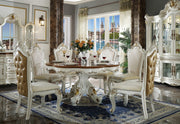 ACME Picardy Dining Table w/Double Pedestal, Antique Pearl & Cherry Oak (1Set/3Ctn), 49"W x 84" ~ 120"L (Includes 2 x 18" Leaves), 270lbs. Inspire your home and create an upscale atmosphere with the Picardy dining room collection. This dining table adds classic style to any sitting area featuring a traditional handcrafted design. The dual pedestal table features ornate feet, an intricately carved table edge, and two 18-inch leaf for hosting extra guests. Features: - Rectangular Double Pedestal Table - Wooden Top (2 x 18" Extension) - Raised Scrolled & Floral Motifs - Padded Seat & Back: Fabric & PU Cushion - Button Tufted (Outside Backrest) - Nailhead Trim - Matching Hutch & Buffet: Touch Light - Buffet Drawer: GLIDE Side Metal (Full Ext.), DOVETAIL English, Felt Lined - Collection Picardy Materials: Wood, Poly-Resin