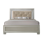 The Platinum King Panel Bed will look super chic in your bedroom! This panel bed features a button tufted headboard, in a faux leather fabric. LED mood lighting on the headboard provides the perfect ambiance at the end of the day. Mirror glass trim along the edges of the bed add another level of style and sophistication to this bed. Bracket feet and a chic, champagne finish complete the look of this stunning piece. - Panel Bed - Button Tufted, Faux Leather Headboard - LED Mood Lighting on Headboard - Mirror Glass Trim - Bracket Feet - Chic, Champagne Finish - Requires Mattress & Box Spring Solid and Plywood Framing Engineered Wood Metal Handles Glass Mirror Detail Trim Faux Leather Metal Nail heads 87 D x 78 W x 63 H, 156lbs. 1 Year Limited Manufacturer Warranty