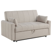 This modern sleeper sofa combines both style and function, featuring luxurious boucle fabric upholstery for a textured, inviting feel. Perfect for small spaces or multi-purpose rooms, the sofa showcases clean lines and vertical channel tufting, adding a contemporary touch to your home. Effortlessly transform it into a bed with a smooth pull-out mechanism, offering a comfortable sleeping area for overnight guests. The plush foam-filled cushions ensure maximum comfort, while built-in casters on the sleeper section make setup easy. With its versatile design and cozy boucle fabric, this sofa is a seamless addition to any living room or guest bedroom.