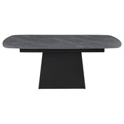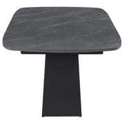 This modern dining table blends sleek aesthetics with functional versatility. The black marble-printed melamine tabletop offers a luxurious look while being scratch- and water-resistant for everyday durability. Its expandable design includes a 15. 75-inch self-storing leaf, allowing the table to extend from 57 inches to 72. 75 inches to accommodate additional guests. A bold, trapezoid-shaped base with a black hammer-tone powder-coated finish provides sturdy support, making this table a stylish centerpiece for contemporary dining spaces.