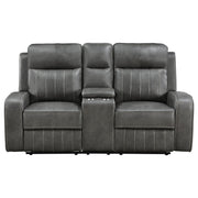 Merging the classic style of both contemporary and transitional design schemes, the motion loveseat creates a dreamy venue for relaxing and entertaining. Choose a pleasing motion loveseat covered in smooth grey leatherette upholstery with vertical topstitching adding decorative elements and a dimensional impact. This loveseat features foam padding on its frame and pocket coil spring seat cushions, as attached back cushions are capped with ultra-plump headrests. Recline into varying positions using a manual control function, and enjoy space efficiency with its wall-hugger design. A convenient center unit features a flip-top console for storing remotes and accessories, and two cup holders to keep beverages handy.