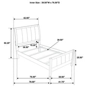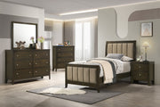 This panel bed adds a luxurious touch to your bedroom with its bold vertical channel tufting on the padded headboard and footboard. The dark cocoa finish complements the soft brown fabric upholstery, creating a warm, inviting aesthetic. The clean lines and vertical detailing provide a sleek, contemporary look while maintaining an air of sophistication. Crafted from high-quality materials, this bed offers both durability and style, making it the perfect centerpiece for your bedroom. Its sturdy design ensures comfort and long-lasting appeal.