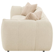 Cuddle up in stylish comfort with this modern extra-long sofa, a perfect interior focal point with its fun bubble-like design. The sofa shows off boucle upholstery in a sand pebble hue, adding an inviting warmth to your décor. It's incredibly comfortable and spacious, featuring wrap-around extra plush channeling with tufted accents on a waterfall bench seat, ideal for large living rooms and lounging or entertaining. Wide armrests are piped to create texture and depth, while offering a sloped design that adds comfort. The sofa is further enhanced with wide corduroy accent pillows filled with premium down-like fill for lasting comfort, and vertical channel tufting decorates the back and arms, adding visual interest.