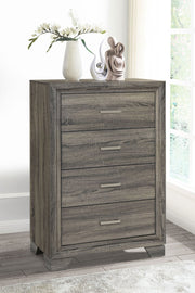 Upgrade your storage options for clothing and accessories with this transitional four-drawer chest. It delivers restrained, understated style with organic appeal, owing to its brown oak wood grain finish. Laminate surfaces add durability and resistance to scratches and dents from everyday wear and tear. Mitered trim surrounds the front of the case, while angular block legs add visual appeal and precision. Bar handles complete the look with a touch of smooth contrast.