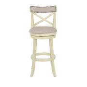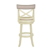 The New Classic York 29" Swivel Bar Stool features a 360° rotation to either side, allowing you to easily engage in conversation. This farmhouse style white Pub Stool is crafted of solid wood with flared legs and a ring footrest at the base for comfort and stability. 100% polyester natural fabric cushion seats and X Back are set off by the nailhead trim on the curved shoulder rest of the York Bar Chair. Versatile use for Kitchen Islands, Bars, Pub Tables, Game Rooms. The Aberdeen Bar Stool is also available as a 24" Counter Height Swivel Stool. Easy to assemble, Smooth swivel action, classic style and made-to-last quality make this chair a standout!