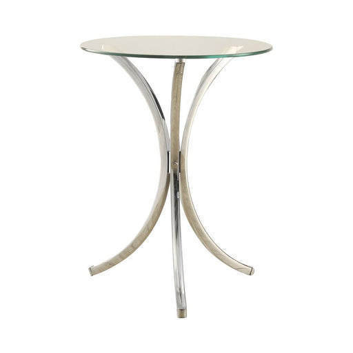 This contemporary side table combines sleek materials and modern design for a striking accent piece. Featuring a round, clear tempered glass top, i...