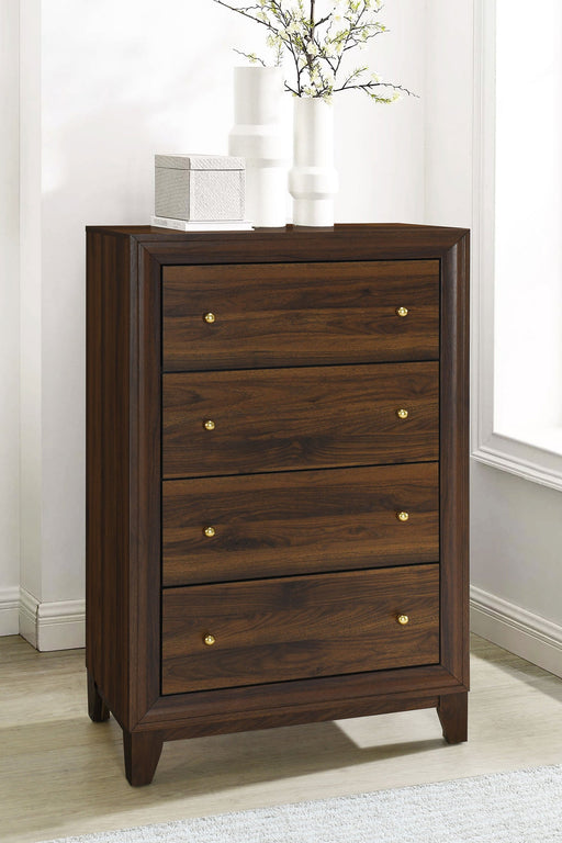 Put finishing touches on your bedroom storage ensemble with this modern five-drawer chest. It offers a refined look and feel with its walnut wood g...