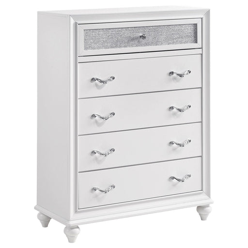Complete the decor of your personal space in stunning, sparkling style. Beautifully adorned with acrylic glitter panels, this five-drawer dresser t...