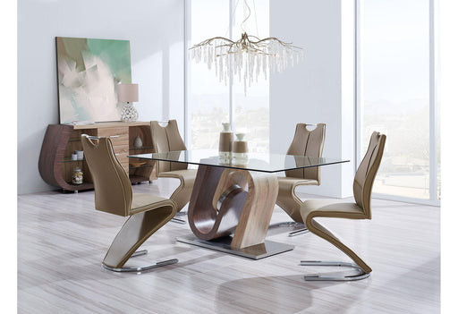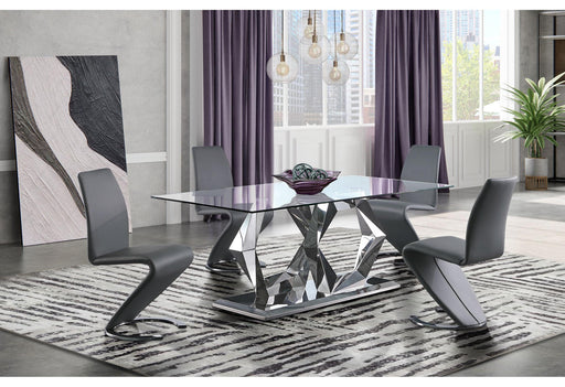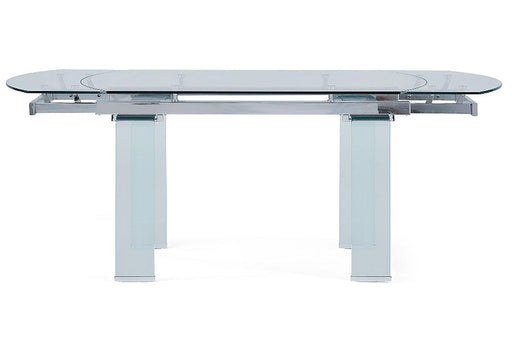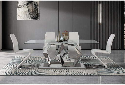 Molded tempered glass and metal combine to create a contemporary dining room table fit for the most modern or minimalist spaces. Bent glass legs, a...