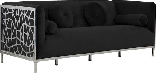 Catch the eyes of all who step foot in your home with this bold Opal black velvet sofa. Its chrome stainless steel patterned design creates a conte...