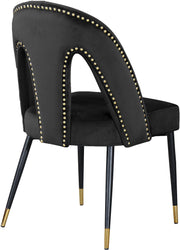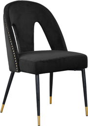 Modern and traditional elements collide in the design of this Akoya Black Velvet Dining Chair. Velvet upholstery covers the back and seat, giving it a decidedly glamorous look while two strategic cutouts provide just a hint of bold, modish fun. The gold nailhead trim on the back adds an edgy vibe, and metal legs in a black finish with goldtone tips rounds out the dining chair providing sturdy support and a contemporary look.