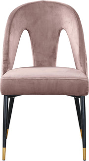 Modern and traditional elements collide in the design of this Akoya Pink Velvet Dining Chair. Velvet upholstery covers the back and seat, giving it a decidedly glamorous look while two strategic cutouts provide just a hint of bold, modish fun. The gold nailhead trim on the back adds an edgy vibe, and metal legs in a black finish with goldtone tips rounds out the dining chair providing sturdy support and a contemporary look.