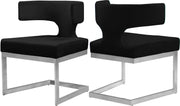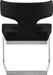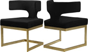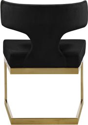 Bring artful living to your dining room with this Alexandra velvet dining chair. This sumptuously appointed chair has a back design that cradles your body as you sit, making dinner time an experiment in total relaxation. Soft black velvet upholstery covers the back and the plumply padded seat, ensuring you get extra cozy while you eat. A rich gold metal base adds to the chair���s beautiful durability.