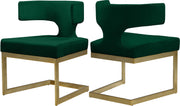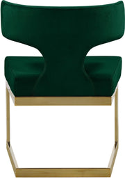 Bring artful living to your dining room with this Alexandra velvet dining chair. This sumptuously appointed chair has a back design that cradles your body as you sit, making dinner time an experiment in total relaxation. Soft green velvet upholstery covers the back and the plumply padded seat, ensuring you get extra cozy while you eat. A rich gold metal base adds to the chair���s beautiful durability.