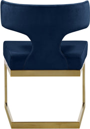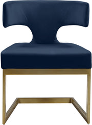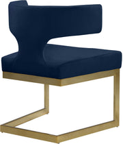 Bring artful living to your dining room with this Alexandra velvet dining chair. This sumptuously appointed chair has a back design that cradles your body as you sit, making dinner time an experiment in total relaxation. Soft navy velvet upholstery covers the back and the plumply padded seat, ensuring you get extra cozy while you eat. A rich gold metal base adds to the chair���s beautiful durability.