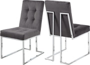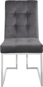 Dine in sophistication and elegance when you're seated in this Alexis grey velvet dining chair. This pretty chair has a modish look that's suitable for nearly any contemporary decor theme. The base is made from stainless steel and has been given a rich chrome finish that lends it added modern panache. The seat is thickly padded and welcoming to the body as you sit through mealtime and converse with family and friends. Plush grey velvet upholstery with tufting on the back and seat cushions finishes off the design on a svelte note.
