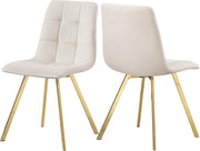 Pull up the Annie soft cream velvet dining chair and sit down for a little while. Decorated with attractive box tufting, this lightweight, contemporary chair has a backrest that gently curves into the seat, and both are cushioned for your comfort. The gold metal legs are square shaped, and they angle out gracefully to give this chair added stability. The Annie pairs nicely with several of the dining tables available.