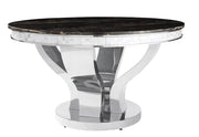 This uniquely-designed dining table has a solid appeal that's sure to please. It has a large round top with a handsome marble-like design. The table edge is fashioned in contrasting burnished silver. The curved silver legs are wide for a strong, distinctive stance atop a solid silver base. Pull up a set of well-appointed chairs and make this a complete dining set for any dining space.