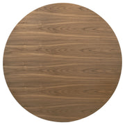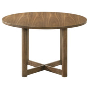 Embrace casual dining with the inviting ambiance of a modern round dining table. Crafted with a walnut finish over walnut veneer, it's a delightful centerpiece in a welcoming kitchen or dining room. Its round silhouette creates a unifying ambiance, perfect for seating four in comfort. The table boasts round post legs with an X-cross base that adds the perfect hint of visual dimension and texture. Choose flowers from the garden or seasonal decor for a charming finishing touch.