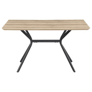 Freshen up your kitchen or dining room with a modern casual dining table. Its rectangular silhouette is versatile and stylish, perfect for multi-functional spaces like breakfast nooks and compact dining rooms. It boasts a medium brown wood grain tabletop finish, crafted with melamine for excellent durability and resistance to denting and scratches. An angled edge adds polished flair, perfect for an approachable, contemporary space. The table's base features four angular V-shaped legs with a crossbar support, all in a black finish over metal construction that provides stability.