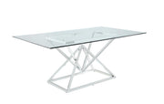 Elevate your dining space with this contemporary dining table featuring a 12mm clear glass top and an artistic polished stainless steel base. The angular geometric design adds a modern flair, while the rectangular shape offers generous space for entertaining. With its sleek materials and sophisticated presence, this table is perfect for creating a luxurious and upscale atmosphere in any dining room.