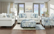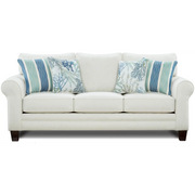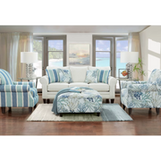 Ocean colored blues and beachy colored coral reefs wisp over the crispy white background of our Barrier collection. Like peaceful waves calmly kiss the edge of the shore, so do the rolled arms to the outer edges of this silhouette. Tall, dark brown tapered legs perfectly accent the perimeter, while welt brings definition to the sweeping lines and contours. As your toes press into the cool, wet sand, calmness overshadows the outside world. Inhale, release!