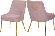Elegance invades your dining room when you add this Ace velvet dining chair to the mix. This beautiful chair features the bells and whistles you need to take your dining room to the next level decoratively. The chair is outfitted in soft pink velvet upholstery with a pleated design for added textural appeal. Polished gold legs with ball feet and a matching gold handle on the back round out the design on a stylish note.