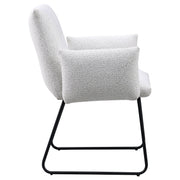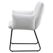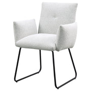 Elevate your dining experience with this modern dining chair, designed for both comfort and style. Upholstered in soft fabric, this chair provides a cozy seat for everyday dining or special gatherings. The chair features a contemporary design with gently curved armrests and a sleek, powder-coated black metal sled base for a minimalist yet bold look. Its clean lines and subtle elegance make it a perfect addition to any modern dining room or kitchen space.
