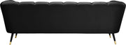 Sink your body into the inviting comfort of this Beaumont velvet sofa. Upholstered in a soft shade of black with black metal legs tipped in gold, this chair oozes modern charm and up-to-the-minute comfort. The heavily stuffed arms, seat and back are bound to beckon at day���s end for you to sit and relax. Deep channel tufting on the back and arms adds to its uber welcoming look. Pair it with the matching pieces in the same collection for cohesive beauty.