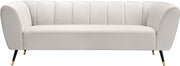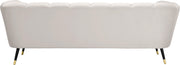 Sink your body into the inviting comfort of this Beaumont velvet sofa. Upholstered in a soft shade of cream with black metal legs tipped in gold, this chair oozes modern charm and up-to-the-minute comfort. The heavily stuffed arms, seat and back are bound to beckon at day���s end for you to sit and relax. Deep channel tufting on the back and arms adds to its uber welcoming look. Pair it with the matching pieces in the same collection for cohesive beauty.